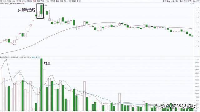 如图2-2所示为光明肉业(600073)的日K线元前期低点启动后,经历了短期快速上涨,在高位形成了这种头部刺透线的走势。第一天股价以大阳线收盘,显示出市场的强势,然而,第二天股价高开后,却在持续的卖盘打压下一路低走,最终收盘价切入前一日大阳线实体的一半以上,且当日成交量显著放大。这些迹象清晰表明主力在前期快速拉升后已开始大规模出货,顶部信号极为明显,投资者需高度警惕。次日股价又收出一根重心下移的小阴线,进一步确认了趋势反转,此时投资者应毫不犹豫地清空仓位,若心存侥幸继续持仓,很可能面临股价持续下跌的风险。